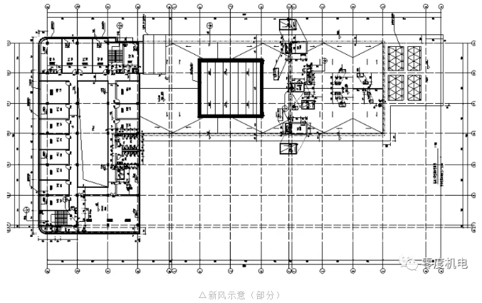 本項目采用新風加風機盤管系統的空調,采用吊頂式空氣處理機組加全熱交換式換氣機,既引入室外新風,又排除室內污濁空氣、并回收排風中的冷量。空調季節時全熱交換機與吊頂式空調機同步開啟,非空調季節時開啟屋頂排風機通風。 ◎暖通設計圖